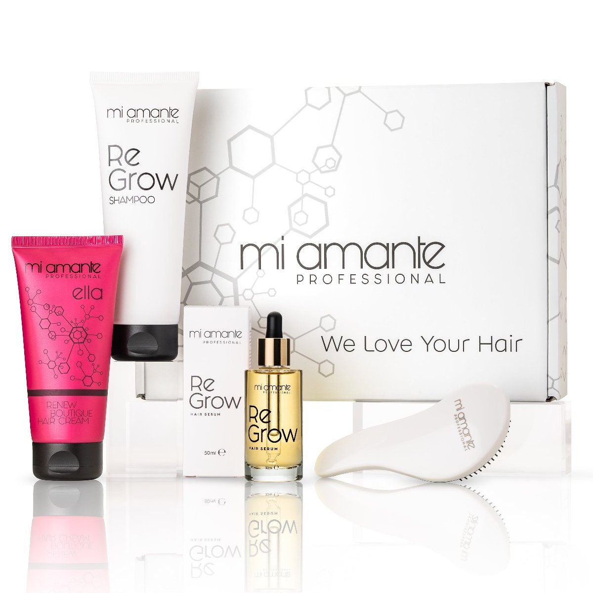 Zestaw zawiera bezsiarczanowy szampon, który polecamy dla maksymalnego efektu, serum na porost ReGrow, krem do włosów Ella oraz szczotkę do włosów Mi Amante.