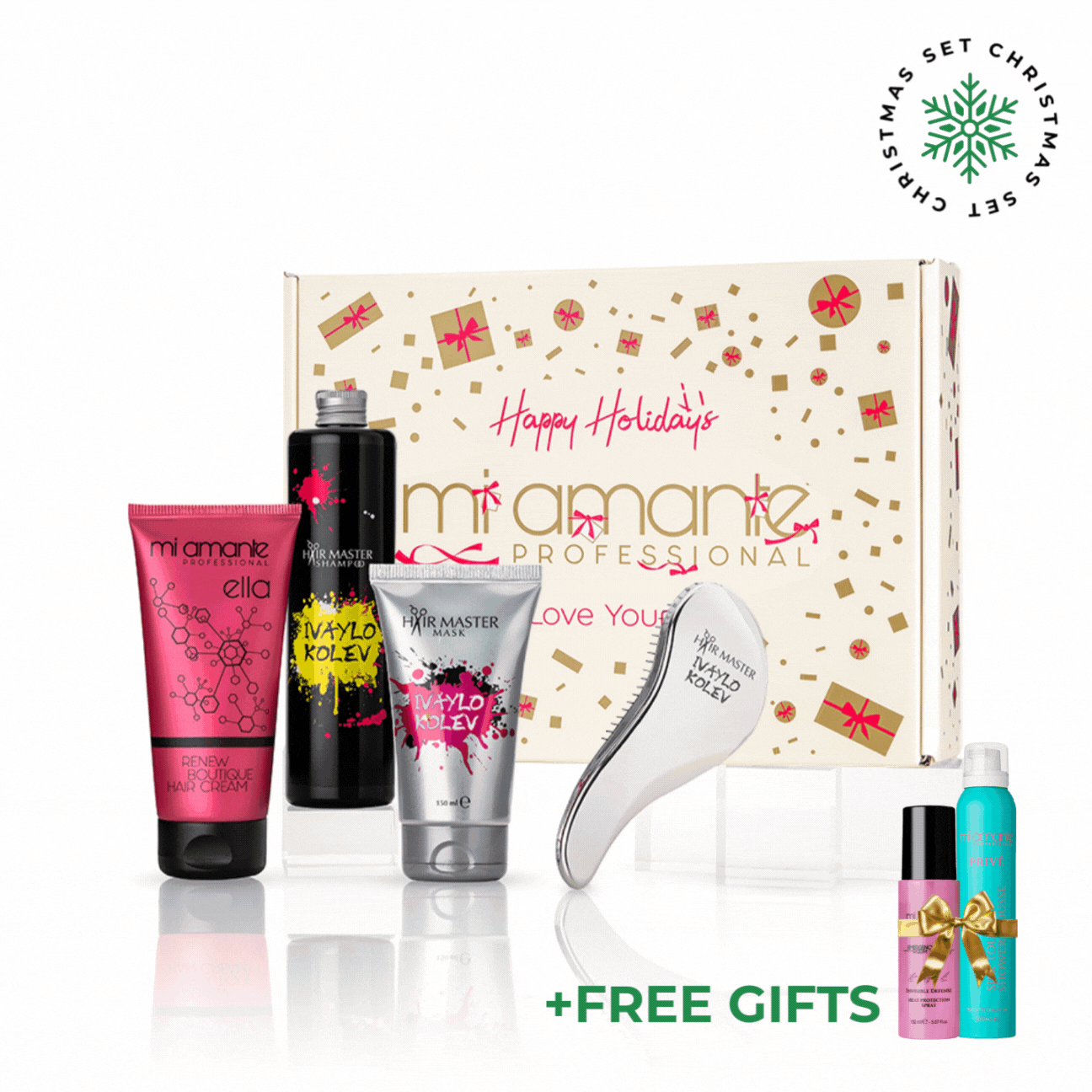 Zestaw Ivaylo Kolev Hair Master All In, który zawiera szampon i maskę Hair Master Ivaylo Kolev, Porto Body Lotion i szczotkę do włosów Ivaylo Kolev.