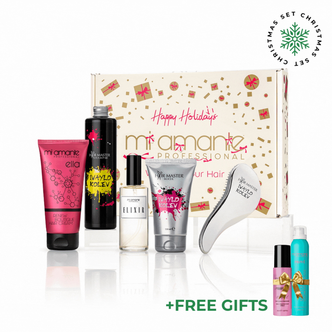Kompletny zestaw do pielęgnacji włosów od Ivaylo Koleva i Mi Amante, który zawiera szampon i maskę od stylisty Ivaylo Koleva oraz krem Ella i eliksir od Mi Amante Professional w specjalnej cenie.